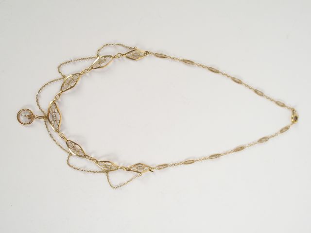 Collier 1900 en or jaune décor de draperies filigrannées rehaussé de petites perles baroques. Poids tel: 5,5gr