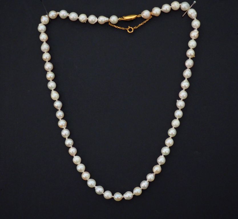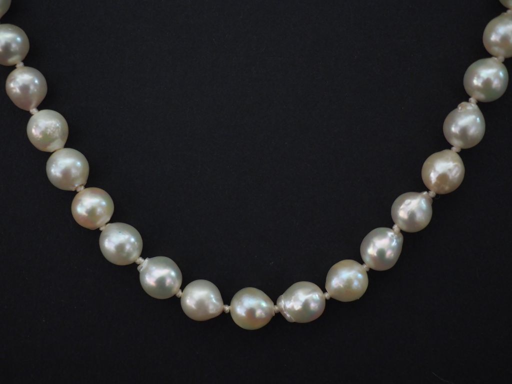Collier de perles blanches de forme baroques. Fermoir en or jaune. Chainette de sécurité en or jaune. Long. 44,5 cm Poids tel. 25,82 g