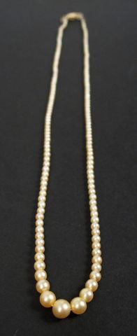 Collier de perles de culture disposées en chute, fermoir or jaune. 44cm