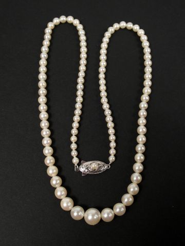 Collier de perles disposées en chute, fermoir en plaqué argent rehaussé d'une perle. 22cm