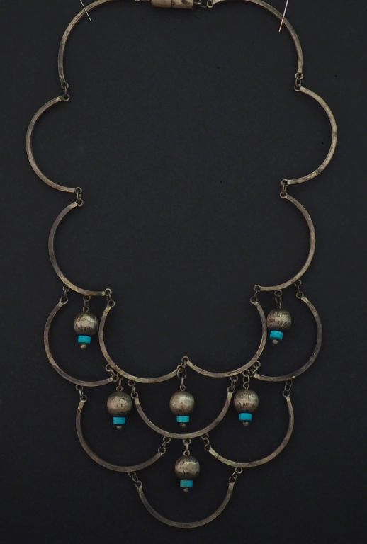 Collier draperie en argent, à décor ajouré et agrémenté de perles en pendeloques ornées d'imitation du turquoise. H. 20,5 cm Poids tel. 42,75 g