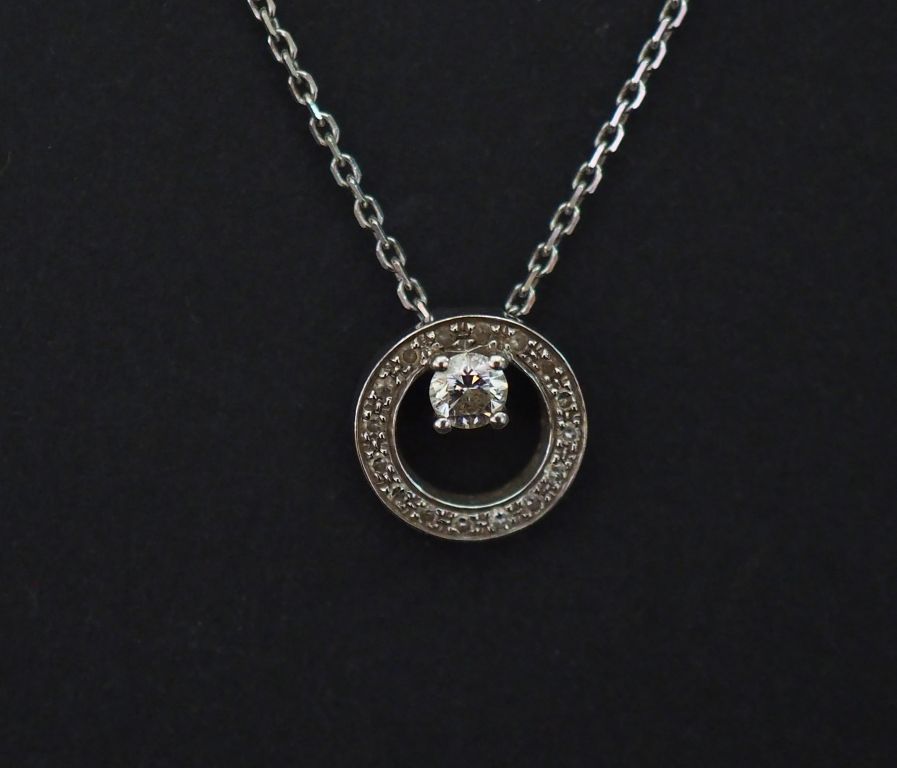 Collier en or blanc, maille forçat, orné en son centre d'un pendentif rond ajouré, serti de petits diamants sur le pourtour et d'un petit diamant de 0,10 ct environ. Long. 43 cm Diam. du pendentif : 0,8 cm Poids tel. 3,01 g
