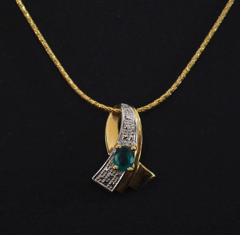 Collier en or jaune 750, maille ronde, agrémenté d'un pendentif de forme stylisé en or jaune 750 et serti d'une émeraude. Dim. du pendentif : 1,7 x 1,1 cm Long. 47 cm Poids tel. 6,05 g