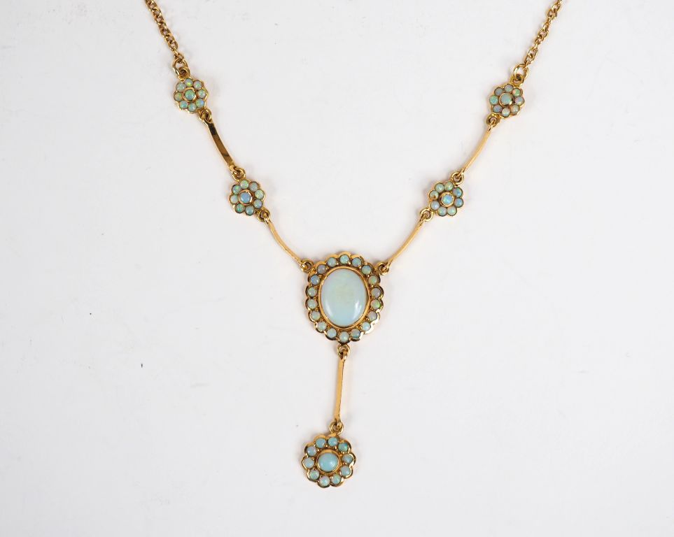 Collier en or jaune et opales, à décor de six fleurs dont une en pendeloque. Poids tel. 9,12 g