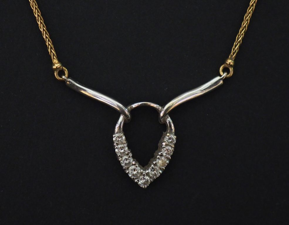 Collier en or jaune, maille ronde tressée, à décor en son centre d'un motif en or blanc, serti de neuf diamants. Long. 41,5 cm Dim. du motif central : 2,5 x 3,2 cm Poids tel. 6,51 g