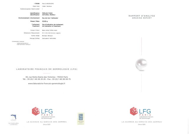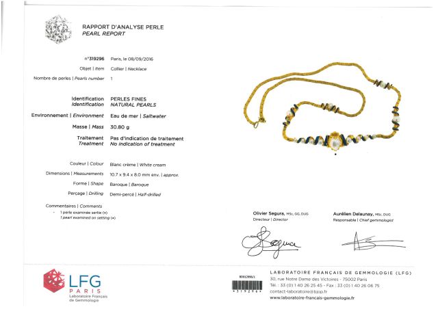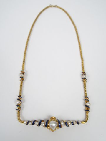 Collier Napoléon III en or jaune, perles fines et émail bleu (sauts d'émail). 52cm environ Poids tel: 30,9gr Certificat du Laboratoire Français de Gemmologie pour la perle centrale.