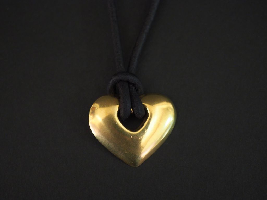 Collier orné d'un pendentif en or jaune ajouré, en forme de cœur. Cordon de cuir noir. Fermoir en or jaune. Long. 44,5 cm Dim. du pendentif : 2,3 x 2,5 cm Poids tel. 12,36 g Poids. du pendentif : 6,70 g