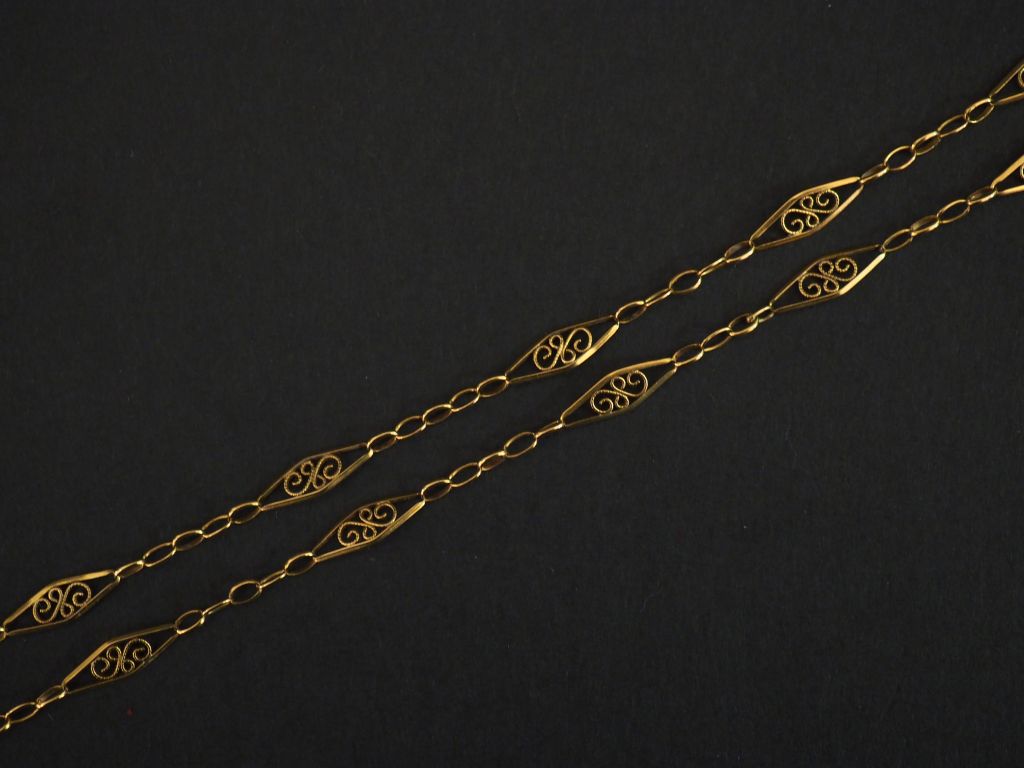 Collier souple en or jaune, composé de maillons ajourés et fligranés. Poids : 3,50 g (accidenté)