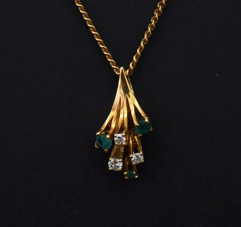 Collier souple en or jaune, maille gourmette, et son pendentif en or jaune en forme de gerbe serti de trois diamants et de trois émeraudes. Chainette de sécurité. Long. 50 cm H. du pendentif : 2,2 cm Poids tel. 11,51 g