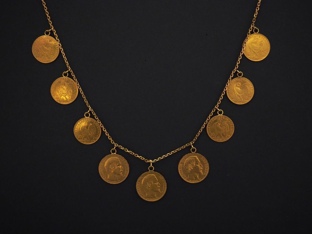 Collier souple en or jaune, orné de quatre pièces de 20 Francs or et six pièces de 10 Francs or en pendeloque. Long. 50 cm Poids. 48,31 g