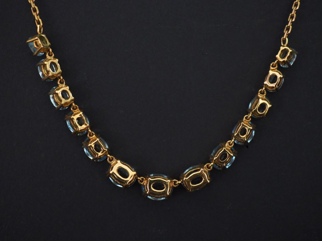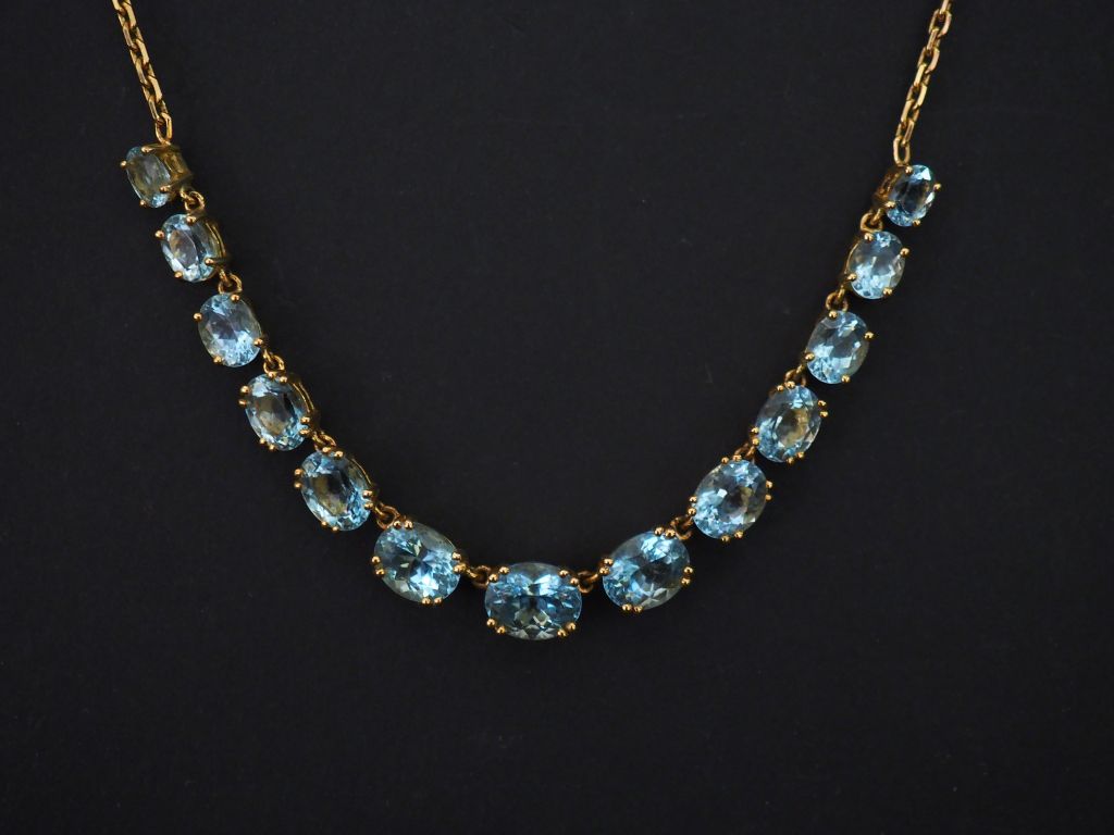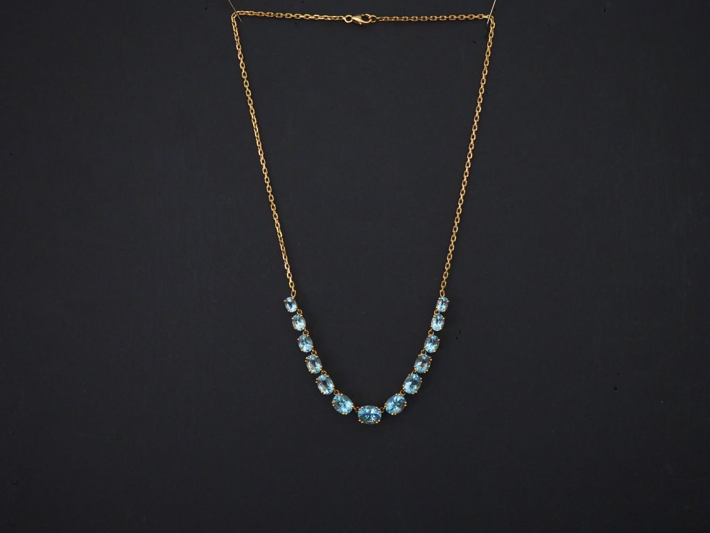 Collier souple en or jaune, serti de treize aigues marines disposées en chute. Long. 43 cm Poids tel. 15,89 g