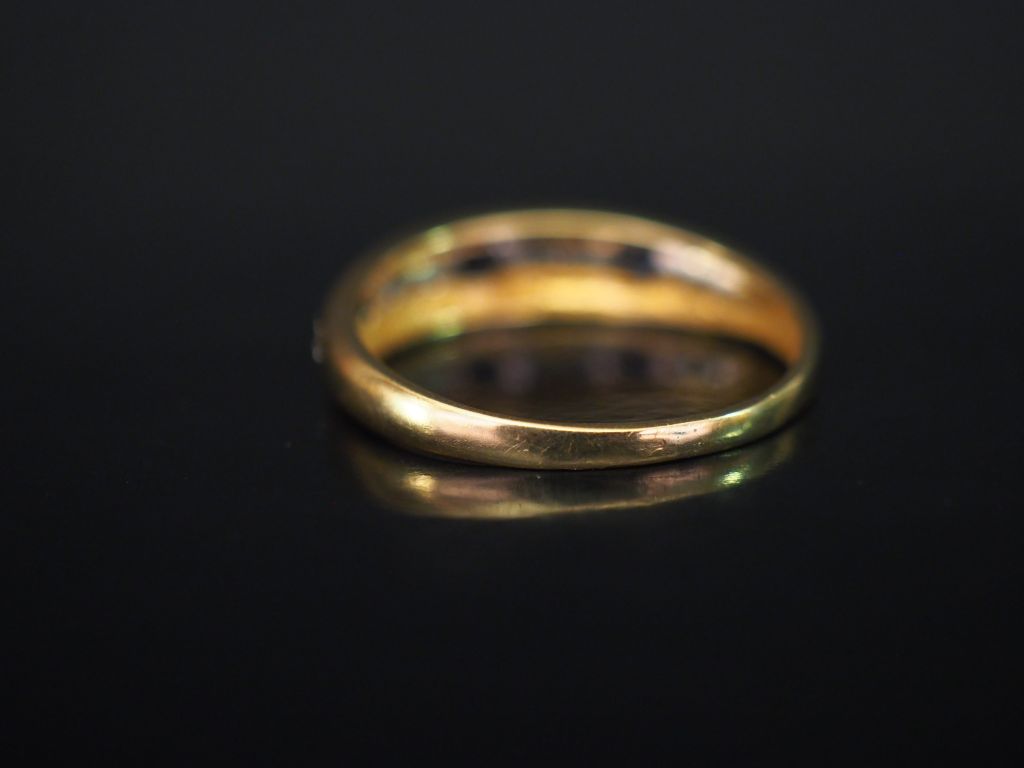 Demi-alliance en or jaune, sertie de pierres bleues calibrées et petits diamants. TDD. 59 1/2 Poids tel. 2,40 g