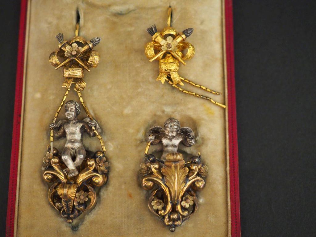 Demi-parure Napoléon III en or jaune et argent. Comprenant : - une broche ajouré, à décor d'amour se balançant parmi des fleurs, rinceaux et feuillage. 3,5 x 5,3 cm - une paire de pendants d'oreilles, à décor de nœud de ruban, trophées et fleurs et d'amour en pendeloque se balançant sur un motif de rinceaux agrémenté de fleurs. H. 7,5 cm (petits manques, l'un accidenté) Poids tel. 37,06 g Dans son écrin