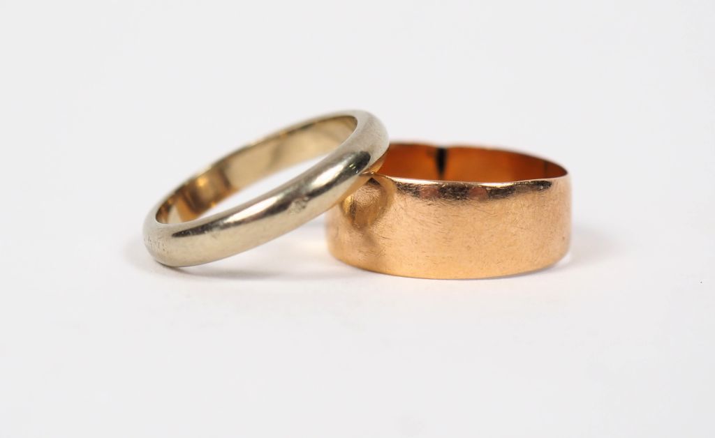 Deux alliances en or, l'une en or jaune et l'autre en or blanc. TDD. 47 et 50 Poids. 5,05 g (soudure à l'une)