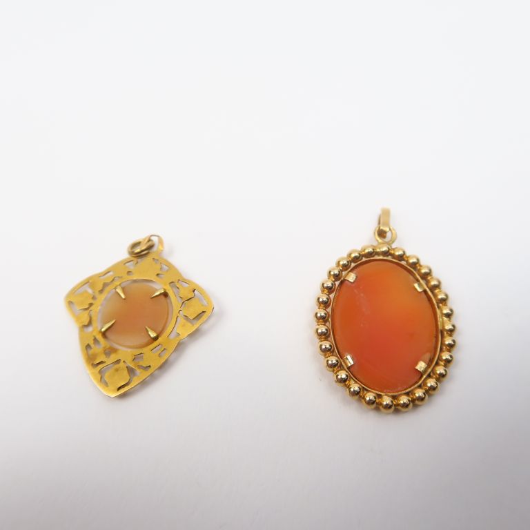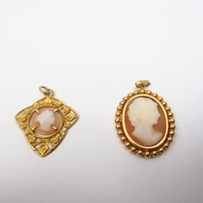 Deux camées figurant des profils de jeunes femmes. Montures or. Poids tel. 4,44 g