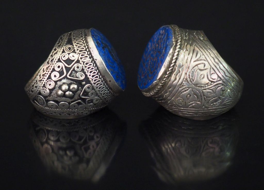Deux différentes bagues Afrique du Nord en argent et lapis-lazuli (?), serties d'une intaille figurant un cervidé pour l'une et des caractères pour l'autre. Les montures, à décor de rinceaux et de motifs géométriques. TDD. 56 et 57 Poids tel. 52 g
