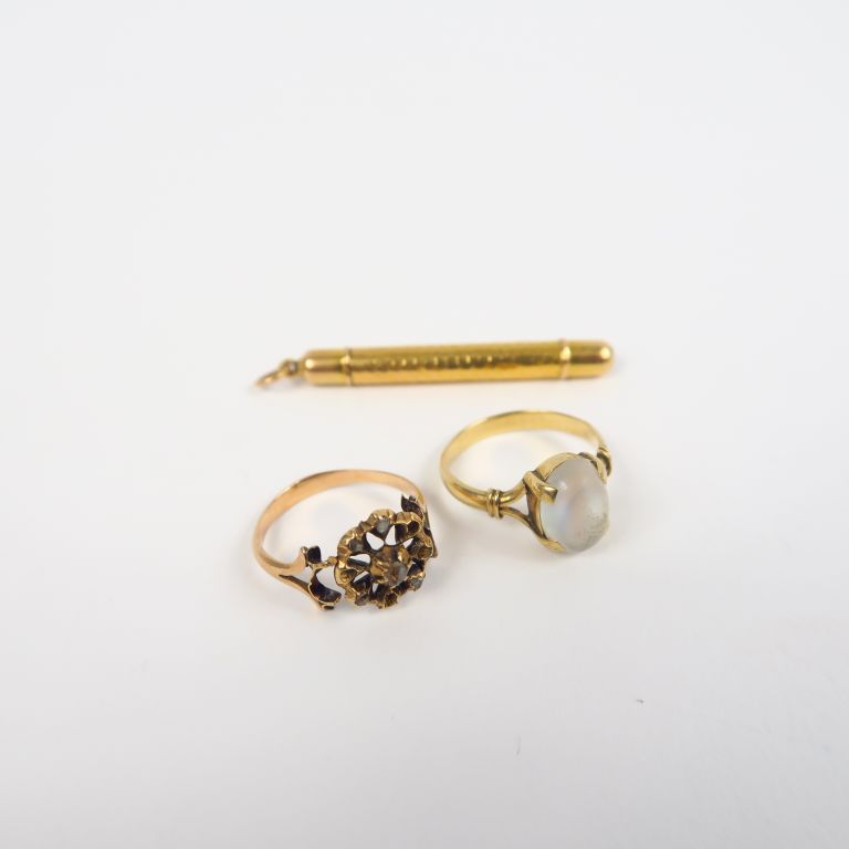 Deux montures de bague or, élément de crayon or. Poids tel. 8 g
