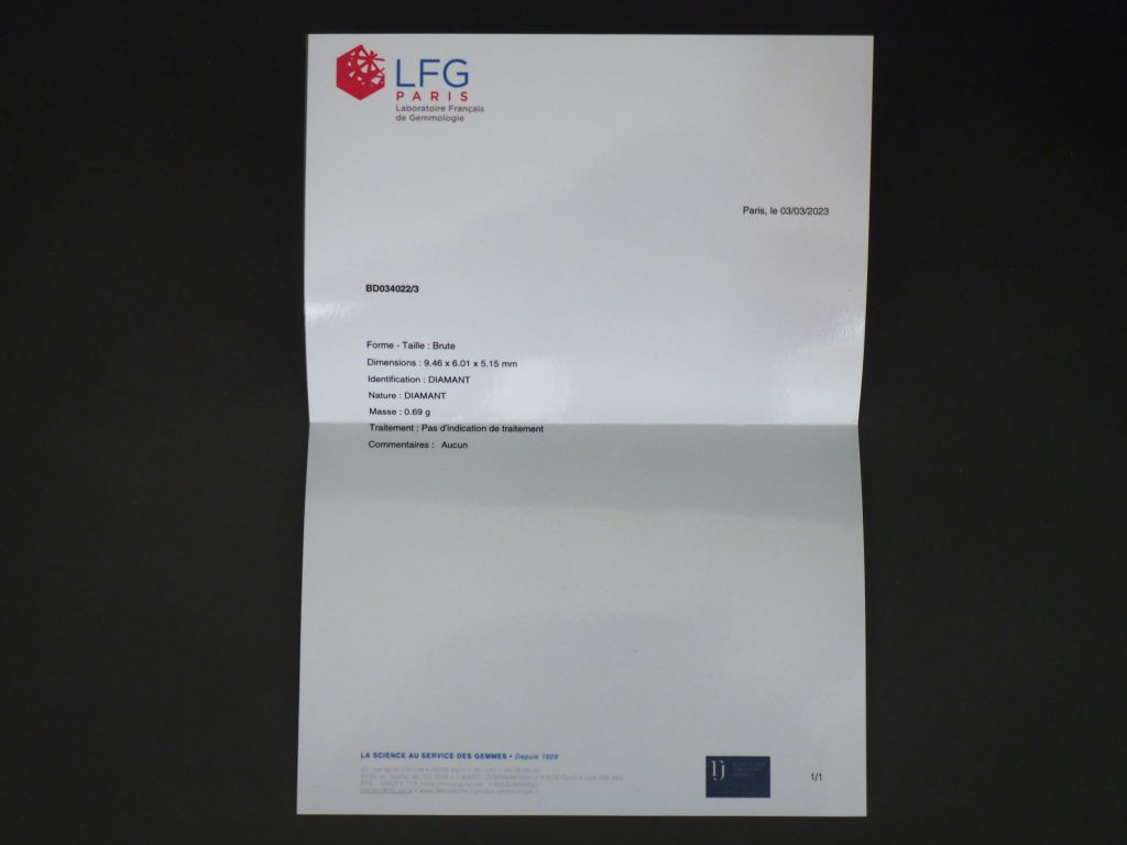 Diamant brut. 9,46 x 6,01 x 5,15 mm Poids. 0,69 g Avec un certificat du Laboratoire Français de Gemmologie.
