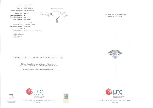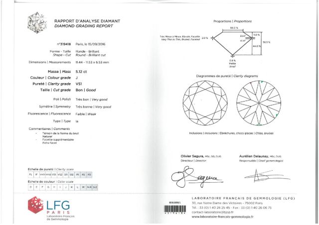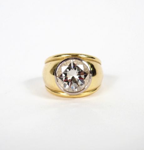 Diamant taille moderne de 5,12cts J-VS1, faible fluorescence, monté en bague (monture or jaune). TDD 53 Poids tel:17gr Certificat du Laboratoire Français de Gemmologie.