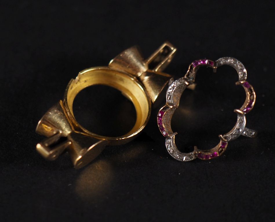 Elément de monture de bracelet en or 750, roses et rubis calibrés fragment de monture de bague Napoléon III en or et roses. Poids tel : 11,10 g