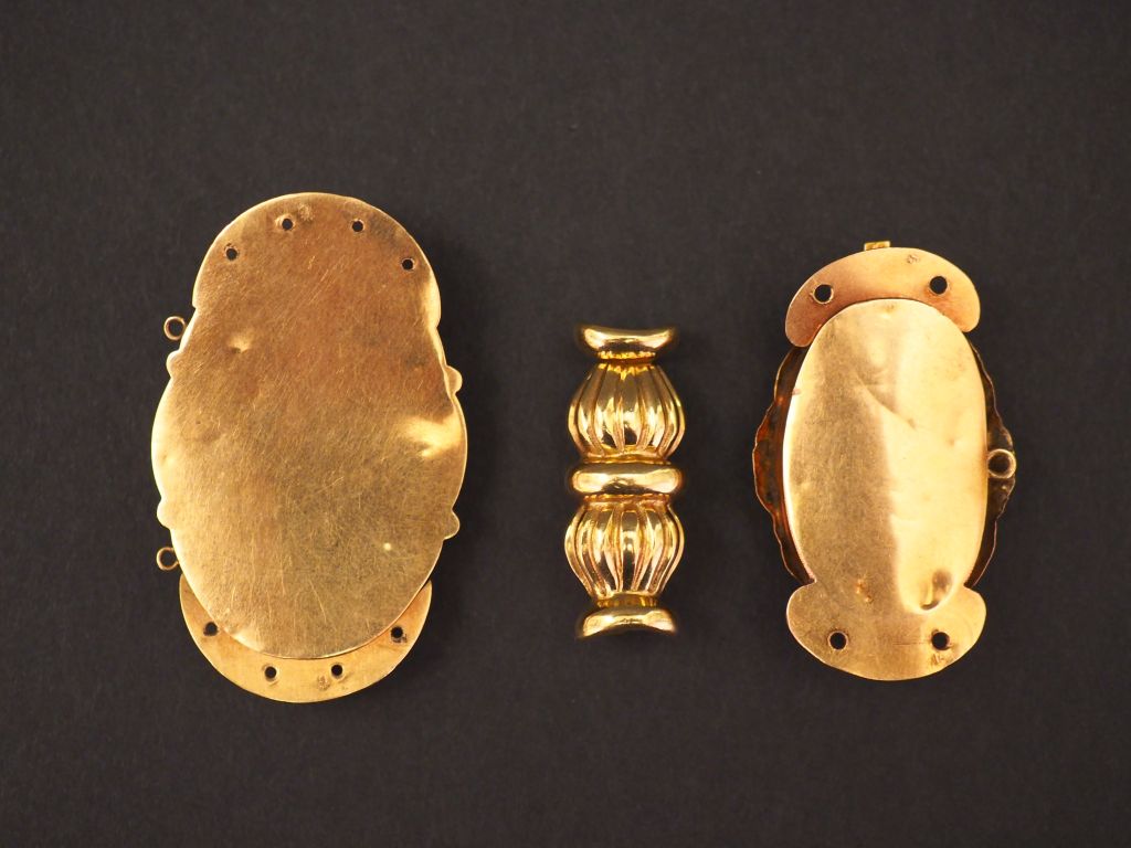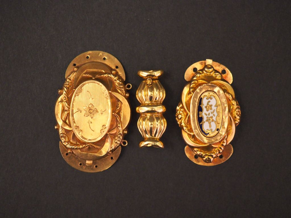 Ensembe comprenant trois différents fermoirs Napoléon III en or jaune. L'un à décor émaillé noir et blanc (sauts d'émail). Poids tel. 14,30 g