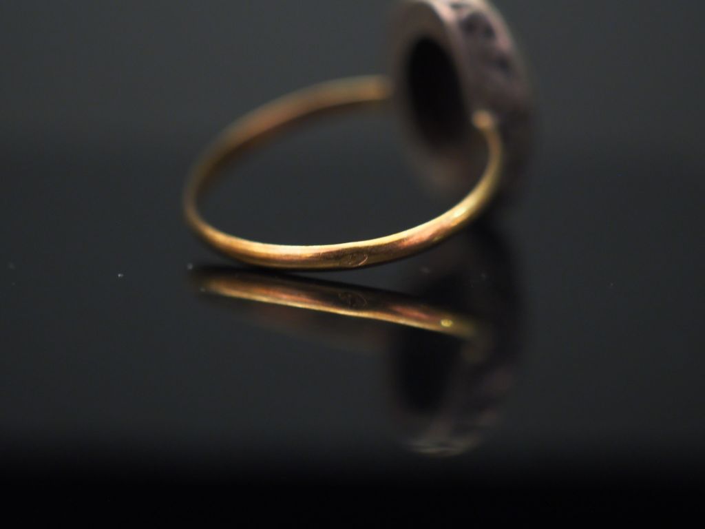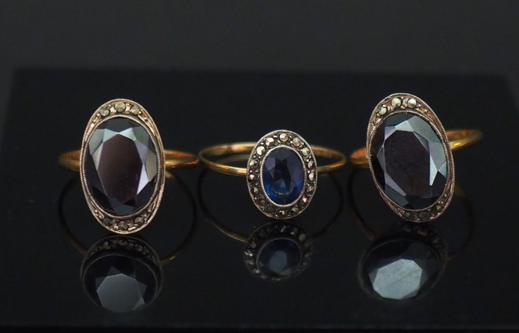 Ensemble comprenant : - deux bagues ovales en or jaune et argent, serties en leur centre d'une pierre noire facettée. Elles sont agrémentées de petites pierres fantaisies. TDD. 52 - une bague marguerite en or jaune et argent, sertie d'une pierre bleue entourée de pierre fantaisie. TDD. 55 Poids tel. 7,09 g (anneau légèrement tordu)