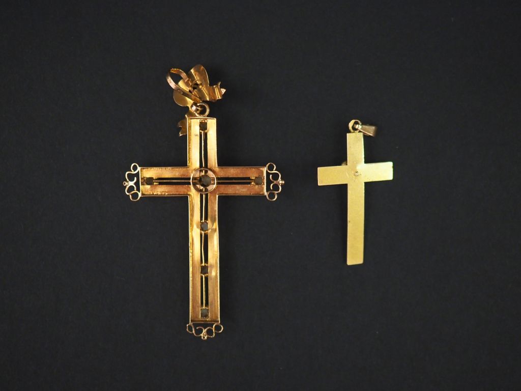 Ensemble comprenant deux différents pendentifs Napoléon III en forme de croix en or jaune et perles. 3 x 1,9 cm et 5 x 3,6 cm Poids tel. 4,70 g