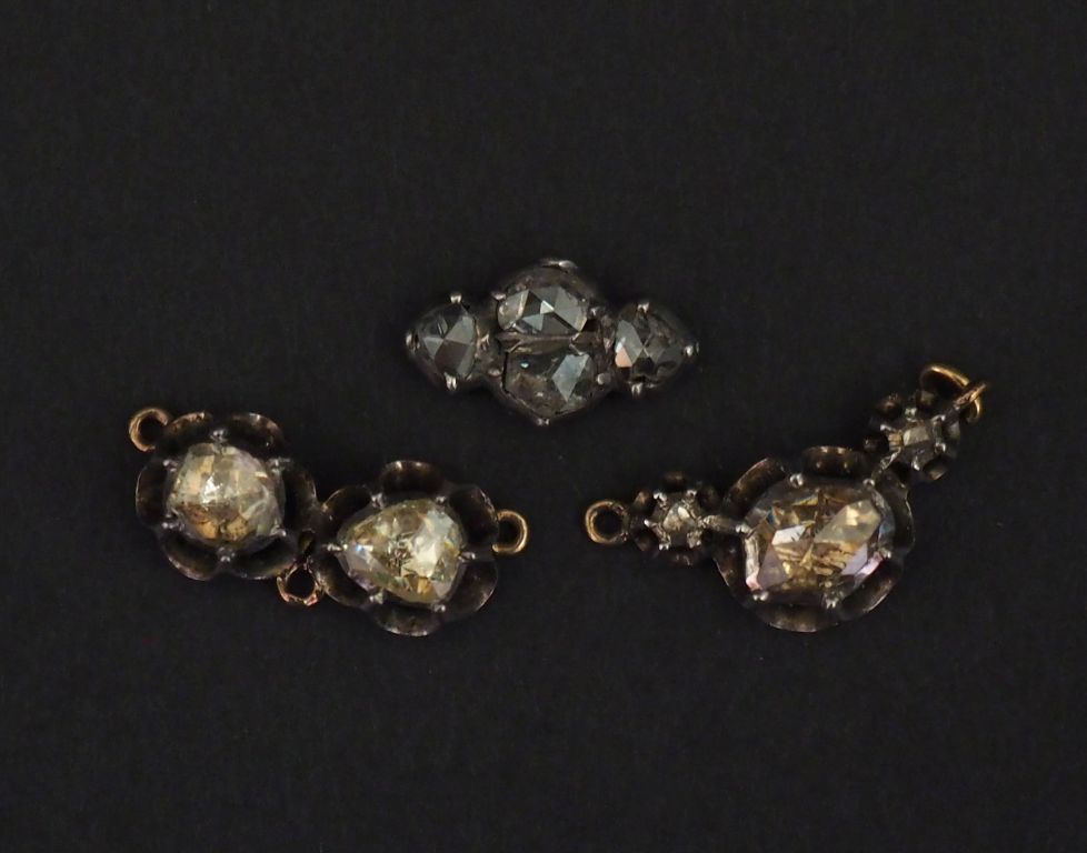 Ensemble comprenant trois éléments de bijoux en argent, sertis de diamants taillés en rose. Long. 2 cm et 1 cm Poids tel. 4,59 g
