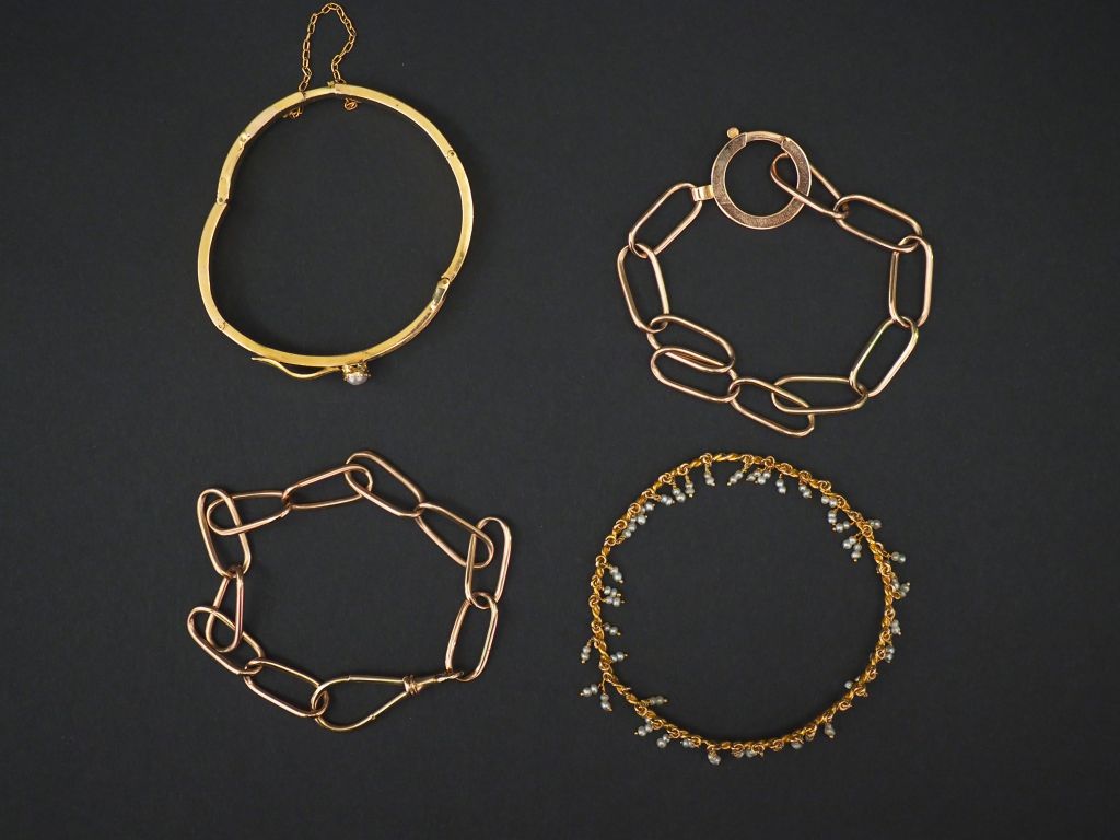 Ensemble comprenant : - un bracelet jonc torsadé en or jaune, à décor de petites perles en pendeloques. Diam. 6 cm Poids tel. 8,70 g (légèrement tordu, très petits manques) - un bracelet Napoléon III en or jaune, à décor de nœud de ruban et de perles en son centre. Poids tel. 13,45 g (manques et accidents) - une giletière transformée en deux bracelets en plaqué or.