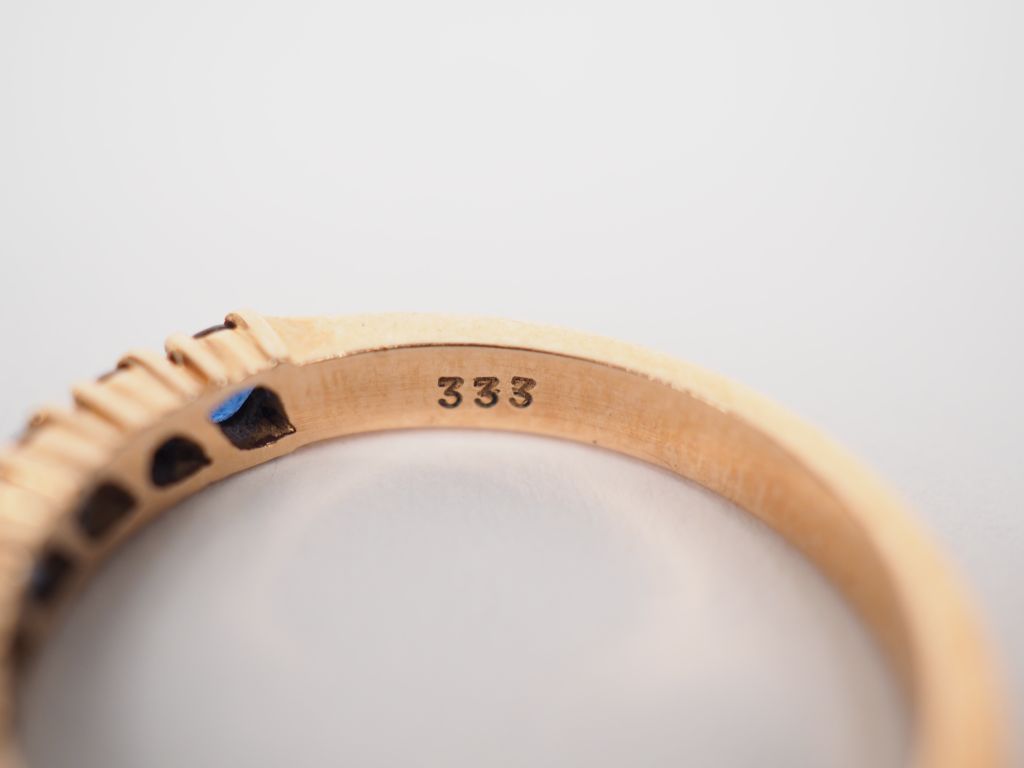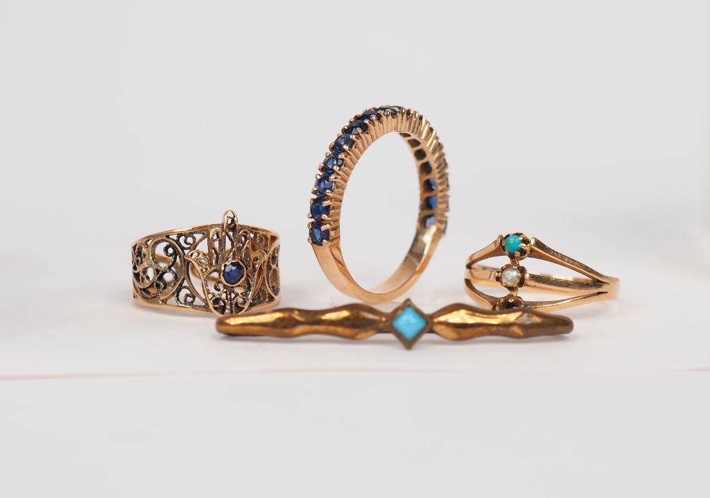 Ensemble comprenant : - un demi alliance américaine en or jaune 9k ornée de petites pierres bleues. - petite bague en or jaune ornée, à décor de perle et de turquoise (manque) Poids tel. 5.50 g On y joint une broche et une bague fantaisie.