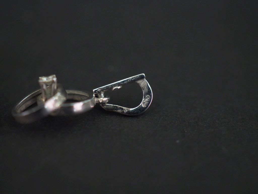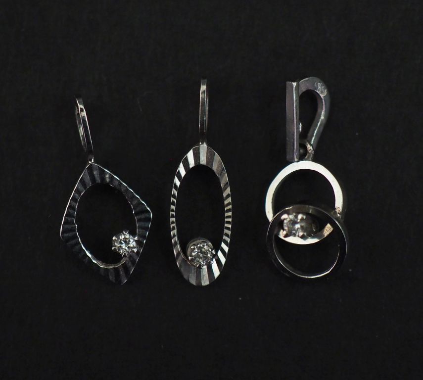 Ensemble comprenant : - un pendentif ajouré de forme ovale en or blanc 750, serti d'un petit diamant. H. 1,3 cm (sans la bélière) - un pendentif ajouré de forme losangique en or blanc 750, serti d'un petit diamant. 1,1 x 0,9 cm (sans la bélière) - un pendentif en or blanc 750 formé de deux cercles entrelacés et serti d'un petit diamant. H. 1 cm Poids tel. 1,69 g