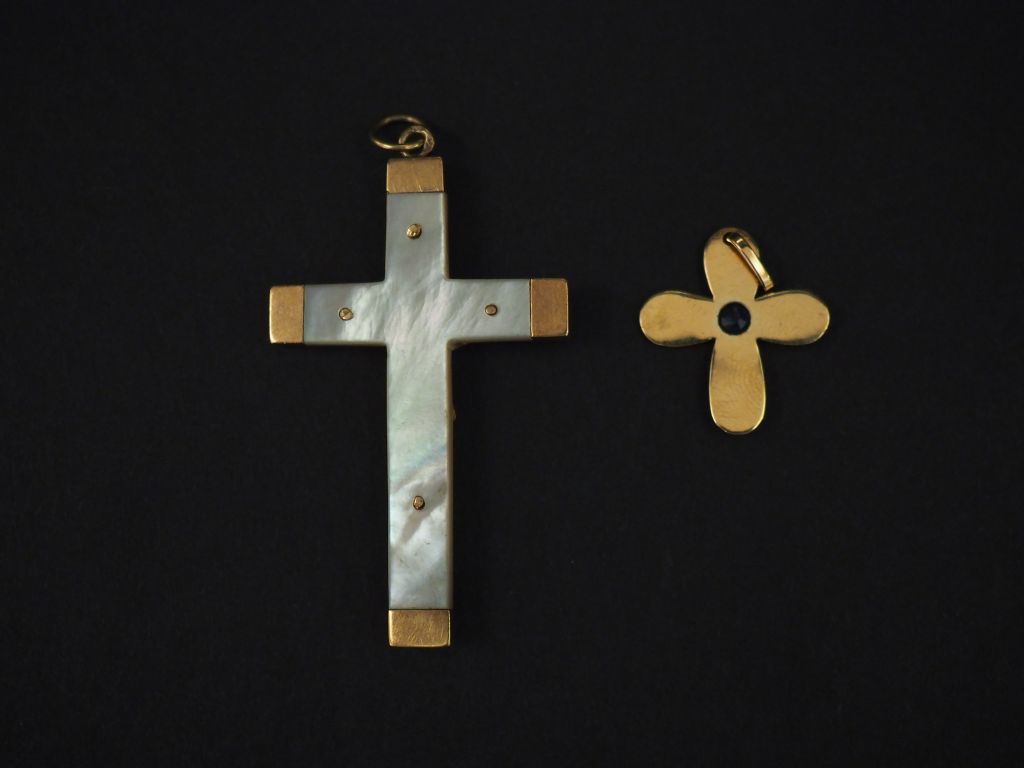 Ensemble comprenant : - un pendentif en forme de croix en or jaune, serti en son centre d’une pierre bleue. Les extrémités arrondis. 2,2 x 1,9 cm - un pendentif en forme de croix en or jaune et nacre. 5 x 3 cm Poids tel. 6,89 g