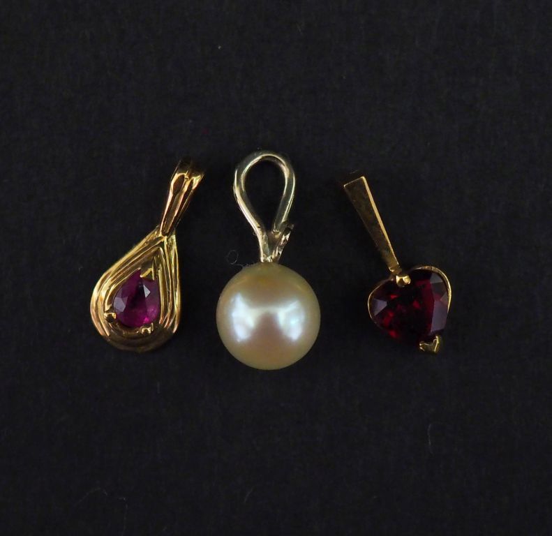 Ensemble comprenant : - un pendentif en forme de goutte en or jaune 750, serti en son centre d'une pierre rose. H. 1,3 c (avec la bélière) - un pendentif en forme de cœur en or jaune 750, serti d'un grenat. H. 1,2 cm (avec la bélière) - un pendentif en or blanc 585, serti d'une perle blanche. H. 1,3 cm (avec la bélière) Poids tel. 1,42 g
