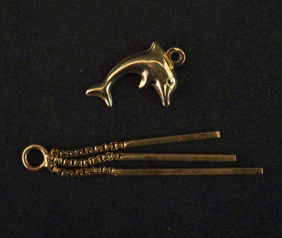 Ensemble comprenant : - un pendentif en or jaune, à décor de trois pendeloques. H. 2,7 cm - un pendentif en or jaune, en forme de dauphin. H. 1 cm Poids. 0,80 g