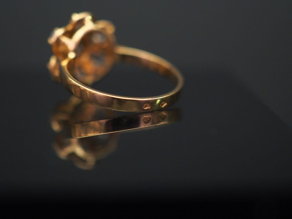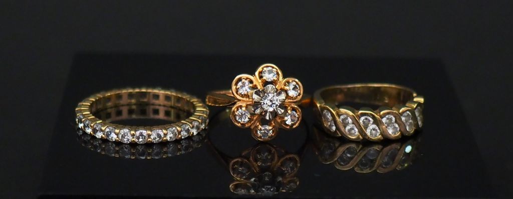 Ensemble comprenant : - une alliance américaine en or jaune, sertie de pierres à l'imitation du diamant. TDD. 57 - une bague jonc en or jaune, sertie de sept ligne de deux pierres à l'imitation du diamant. TDD. 49 g - une bague en or jaune en forme de fleur, sertie de pierres à l'imitation du diamant. TDD. 53 Poids tel. 11 g