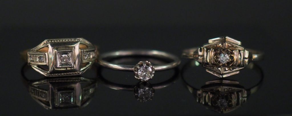 Ensemble comprenant : - une bague de style Art déco deux tons d'or, sertie en son centre d'un petit diamant épaulé de quatre éclats de diamant. TDD. 51 1/2 - une bague de style Art déco en or blanc, sertie en son centre d'un petit diamant taillé en rose. TDD. 55 - une bague solitaire en or blanc, sertie en son centre d'un petit diamant de 0,08 ct environ. TDD. 51 Poids tel. 4,82 g