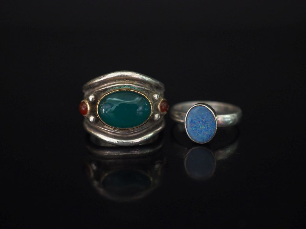 Ensemble comprenant : - une bague en argent, sertie d'une pierre verte en cabochon épaulée de deux petites pierres rouges. TDD. 57 - une bague en argent, sertie en son centre d'une imitation de l'opale. TDD. 56 Poids tel. 20,30 g