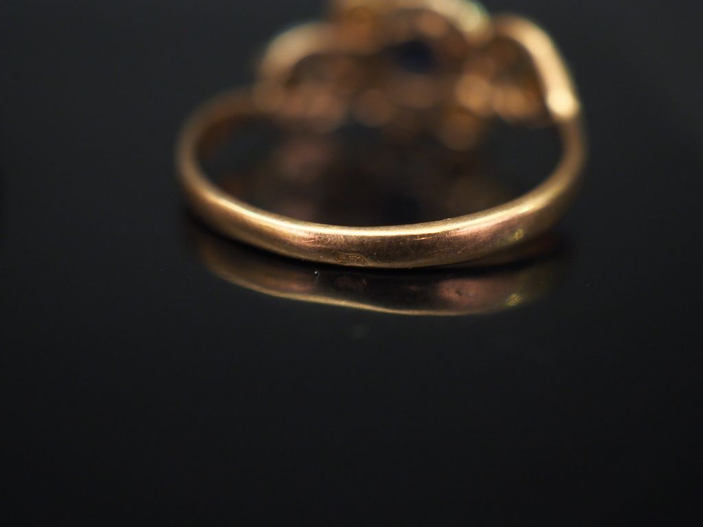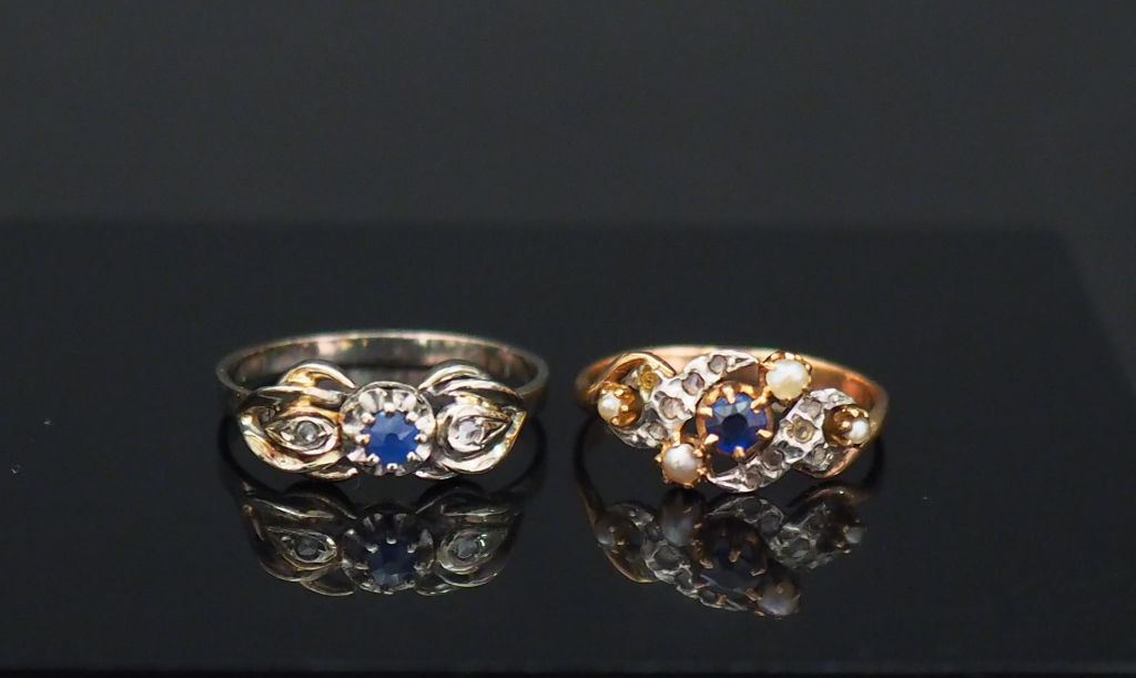 Ensemble comprenant : - une bague en or blanc en forme de nœud, sertie en son centre d'une pierre bleue épaulée de pierres à l'imitation du diamant. TDD. 56 -une bague en or jaune en forme demotif stylisé, sertie d'une pierre bleue, perles et éclats à l'imitation de diamant. TDD. 53 Poids tel. 4,42 g