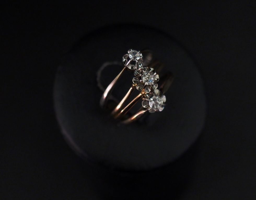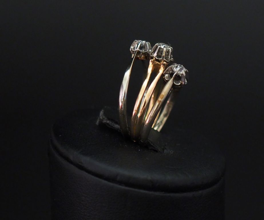 Ensemble comprenant : - une bague solitaire en or jaune, sertie en son centre d'un petit diamant taille ancienne de 0,08 ct environ. TDD. 51 1/2 Poids tel. 2,24 g - une bague solitaire en or blanc, sertie en son centre d'un diamant taille ancienne de 0,07 ct environ. TDD. 50 Poids tel. 1,88 g - une bague solitaire en platine et or blanc, sertie en son centre d'un petit diamant de 0,04 ct environ. TDD. 55 Poids tel. 1,37 g