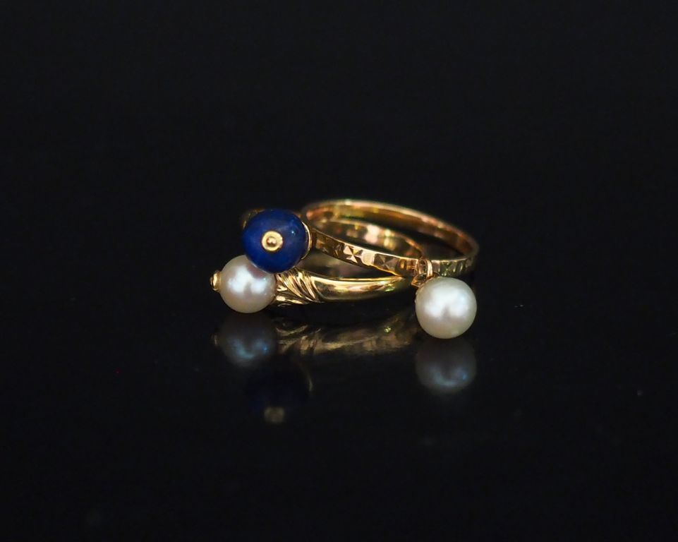 Ensemble comprenant : - une bague "Toi Moi" en or jaune, sertie d'une perle blanche et d'une perle de lapis lazuli. TDD. 53 1/2 - une bague en or jaune, agrémentée d'une perle blanche en pendeloque. TDD. 51 1/2 Poids tel. 3,58 g