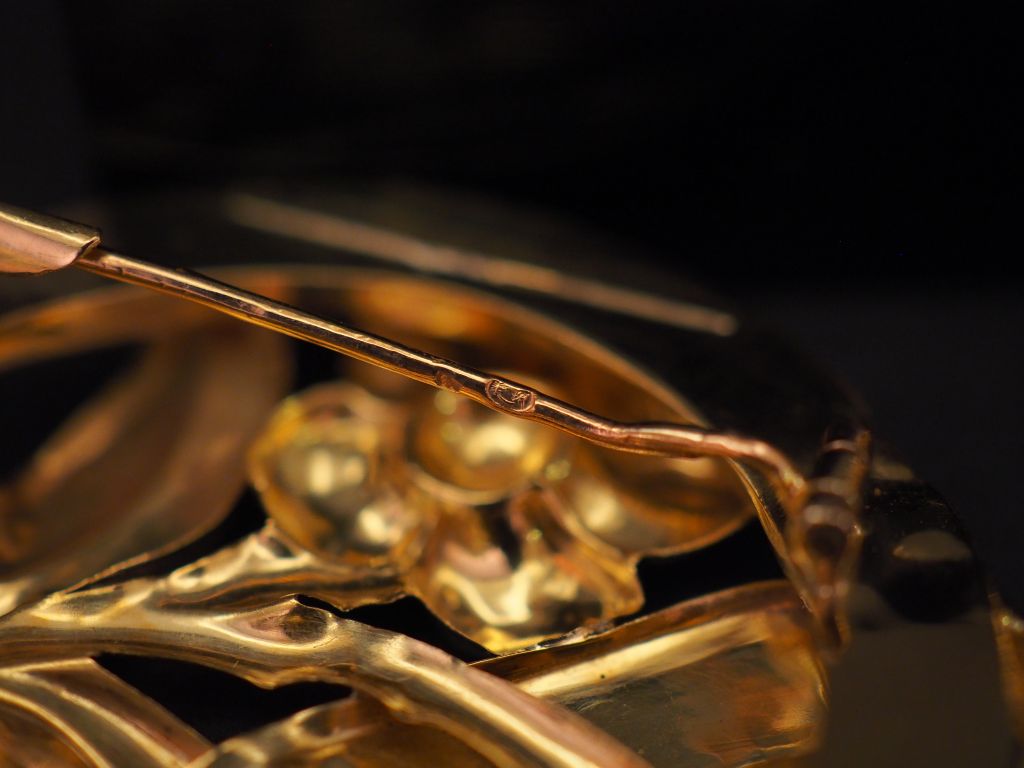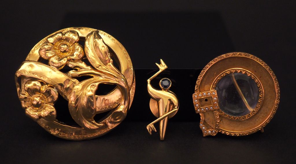 Ensemble comprenant : - une broche Napoléon III en or jaune, à décor ajouré de branchage fleuri. Diam. 4 cm (petits enfoncements) - une broche circulaire Napoléon III en or jaune, à décor d'une boucle de ceinture agrémenté de petites perles. Elle est sertie en son centre d'un verre loupe. Diam. 3 cm Poids tel. 15,16 g On y joint un pin's en or jaune et pierre bleue figurant un sémaphore. H. 3 cm Poids tel. 1,97 g (attache en métal)