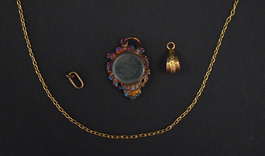 Ensemble comprenant : - une chaine en or jaune, maille forçat. Long. 45 cm - une bélière en or jaune. - un maillon de chaine en or jaune. Poids. 3,44 g On y joint un pendentif porte-photo de style rocaille en or jaune. H. 2,2 cm Poids tel. 1,60 g