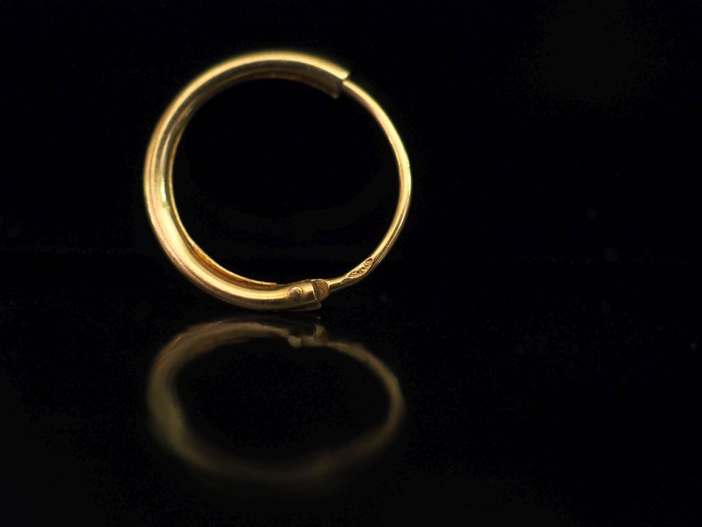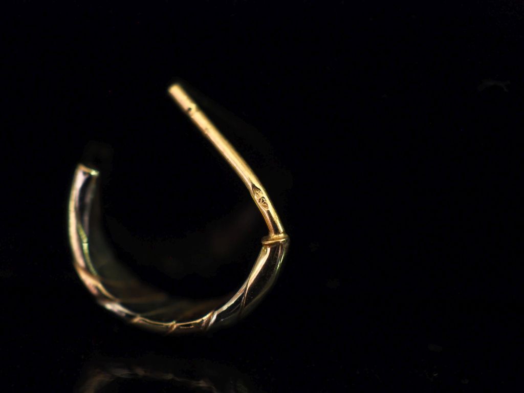 Ensemble comprenant : - une créole torsadée trois tons d'or 750. Diam. 1,8 cm - une petite créole en or jaune 750. Diam. 1,2 cm (accidentée) - une demi créole trois tons d'or 750, à décor de godrons. - une puce d'oreille en or jaune 750, en forme de cœur. H. 0,6 cm - un perce oreille de forme losangique en or jaune 750. 2,5 x 2,3 cm Poids. 2,49 g