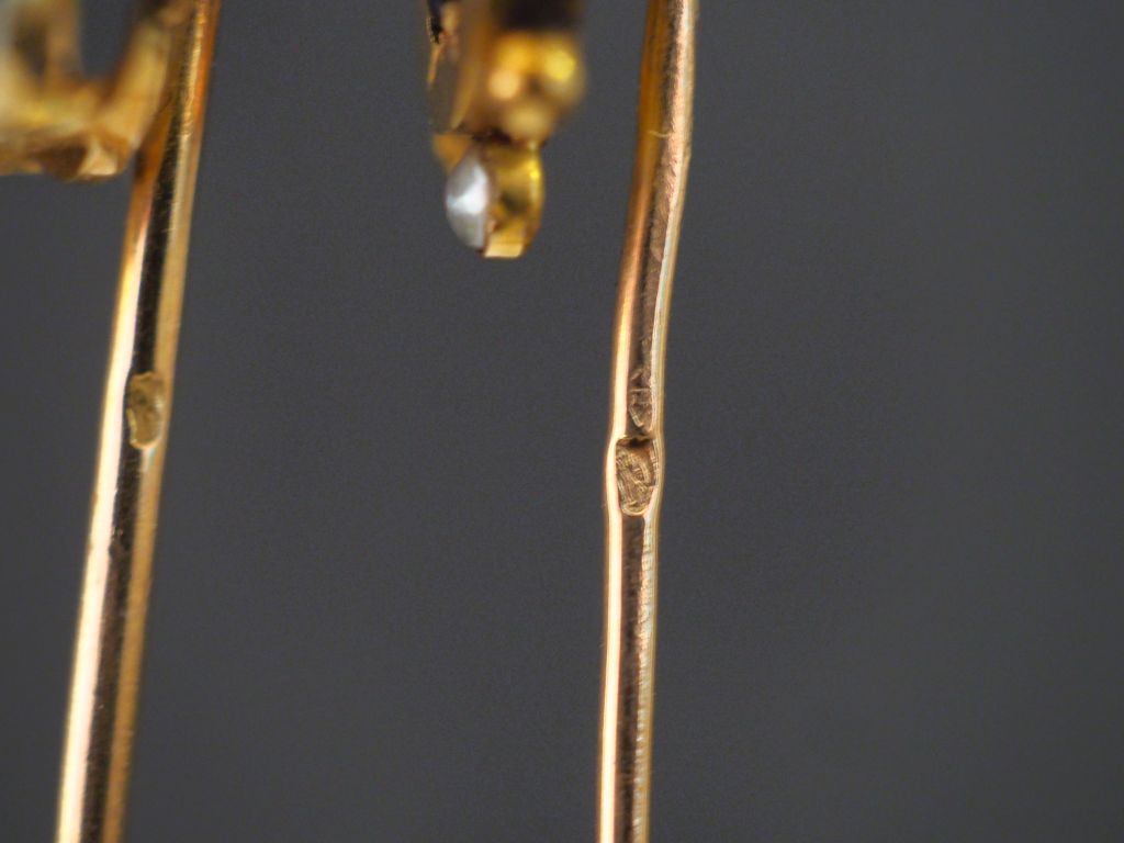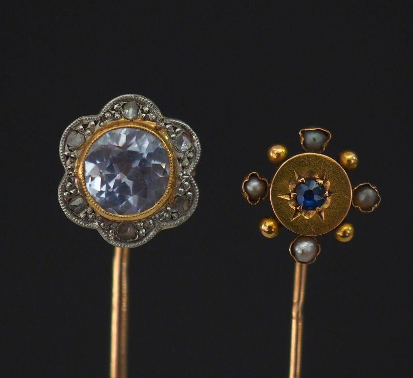 Ensemble comprenant : - une épingle à cravate en or jaune 750, sertie de petites perles et d'une pierre bleu en son centre. Long. 6 cm - une épingle à cravate en or jaune 750, à décor d'un motif de fleur sertie en son centre d'un pierre bleu ciel et entourée d'une couronne de pierres à l'imitation du diamant. Long. 6,8 cm Poids tel. 3,55 g