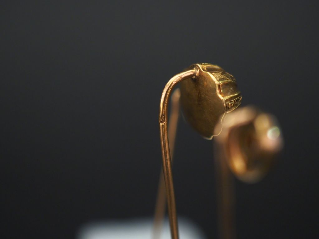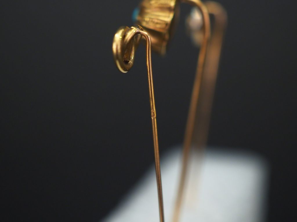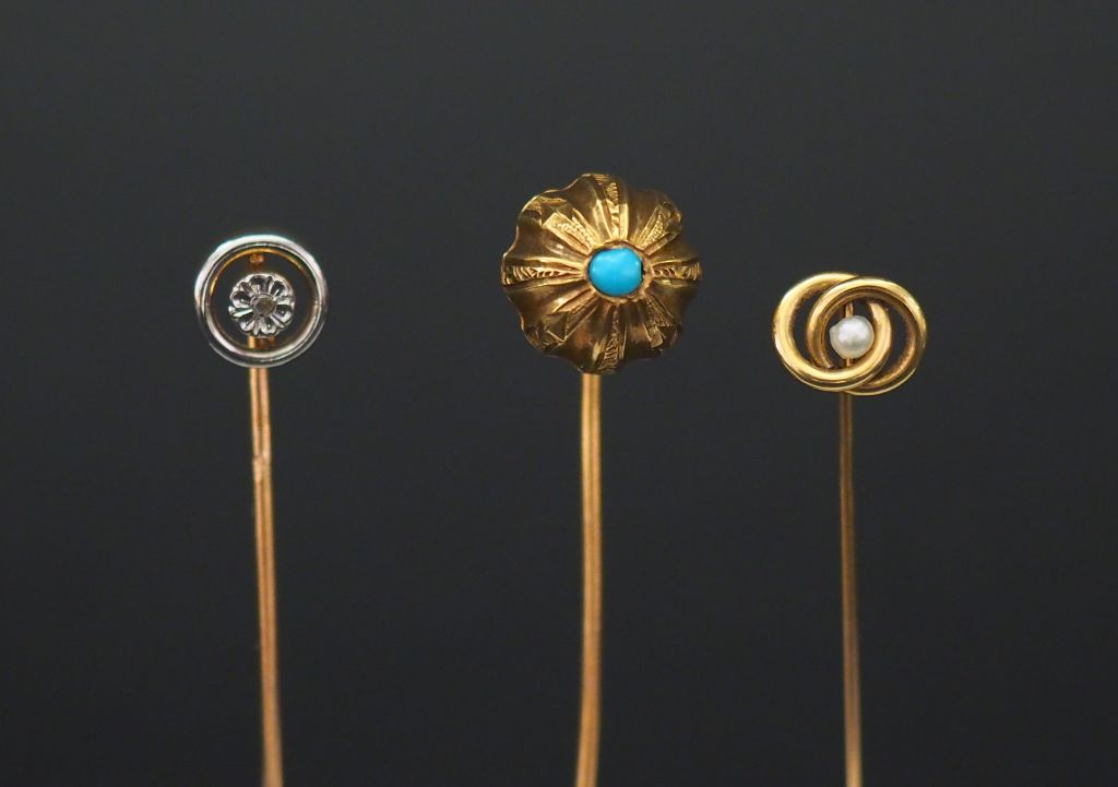 Ensemble comprenant : - une épingle à cravate en or jaune, à décor d’une demi-sphère godronnée, sertie en son centre d’un turquoise en cabochon. Long. 6,5 cm - une épingle à carate en or jaune et perle, à décor de deux cercles entrelacés. Long. 5,6 cm - une épingle en or jaune, sertie en son centre d’un petit éclat de diamant. Long. 6,4 cm Poids tel. 3,91 g