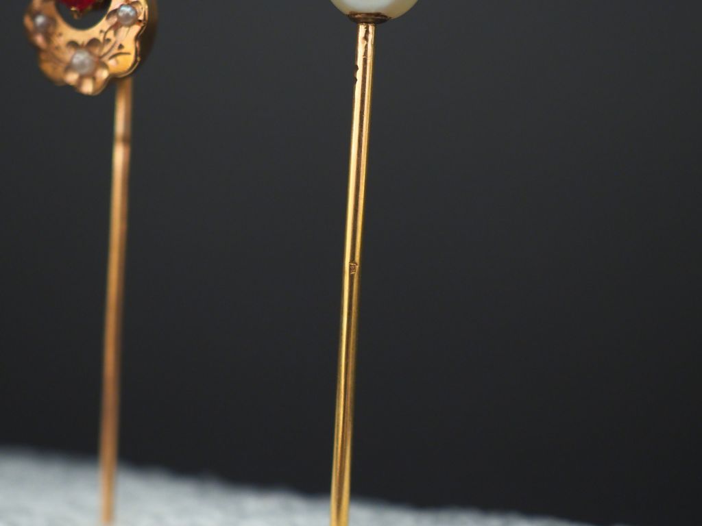 Ensemble comprenant : - une épingle à cravate en or jaune, sertie en son centre d’une perle. Long. 6,6 cm - une épingle à cravate en or jaune et perle. Long. 6,5 cm - une épingle à cravate en or jaune et perle, à décor d’un cercle orné d’une couronne de feuilles. Long. 6,2 cm - une épingle à cravate Napoléon III en or jaune, pierre de couleur et perles, à décor de fleurs. Long. 5,5 cm Poids tel. 5,75 g