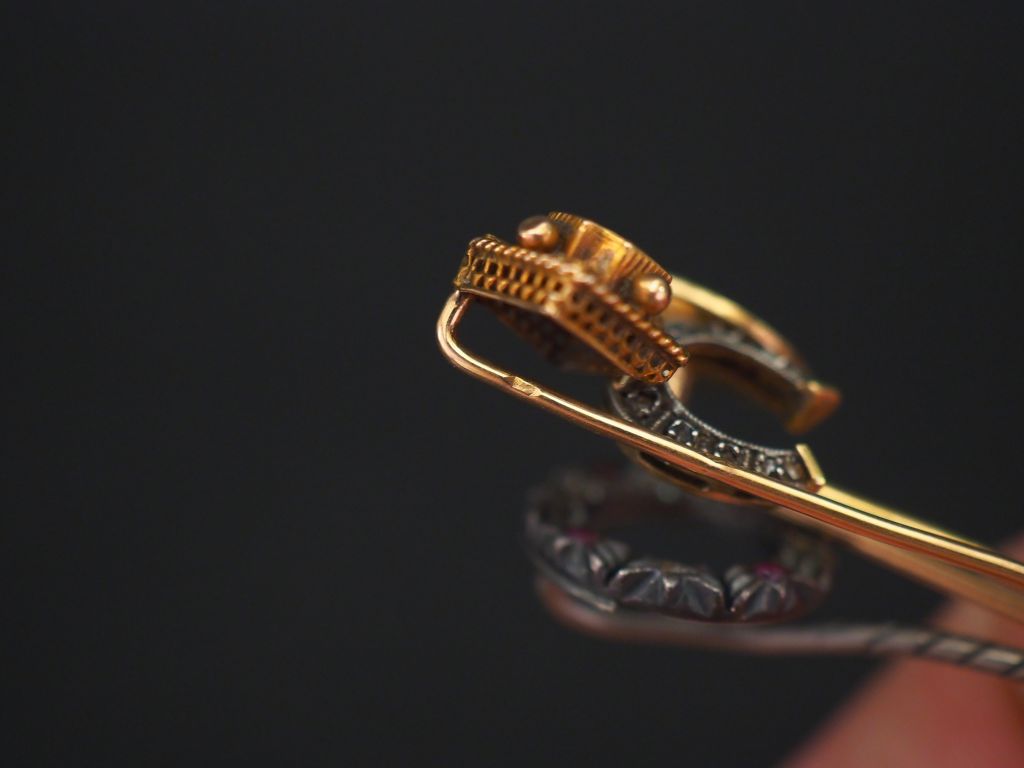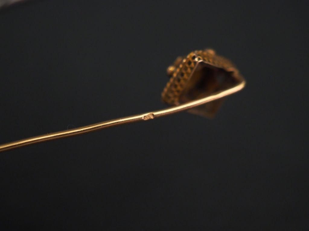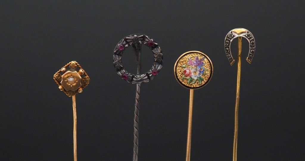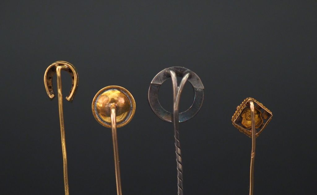 Ensemble comprenant : - une épingle à cravate Napoléon III en or jaune, sertie en son centre d’une perle. Long. 6 cm - une épingle à cravate en or jaune, à décor d’un fer à cheval. Long. 6,5 cm - une épingle à cravate de style Louis XVI en or jaune et émail polychrome, à décor de bouquet de fleurs. Long. 4,9 cm Poids tel. 4,48 g On y joint une épingle à cravate en argent, pierres de couleur et petits diamants taillés en rose. Long. 7,2 cm Poids tel. 2,69 g