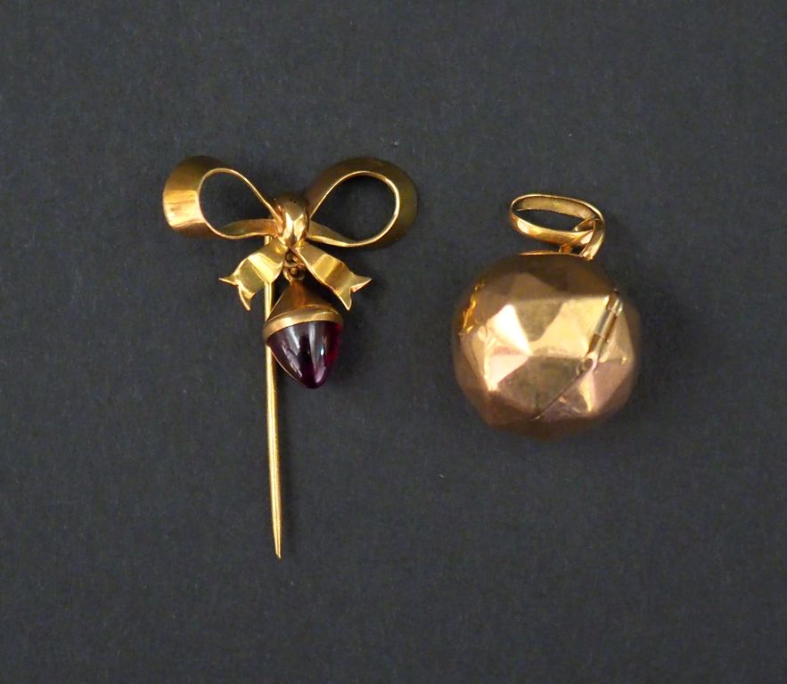 Ensemble comprenant : - une épingle en or jaune en forme de nœud de ruban, à décor d'une pendeloque en forme de gland serti d'une pierre de couleur. Long. 3,7 cm Poids tel. 3,45 g - un pendentif en or jaune, en forme de boule facetté. Poids. (sans le verre) : 4,30 g