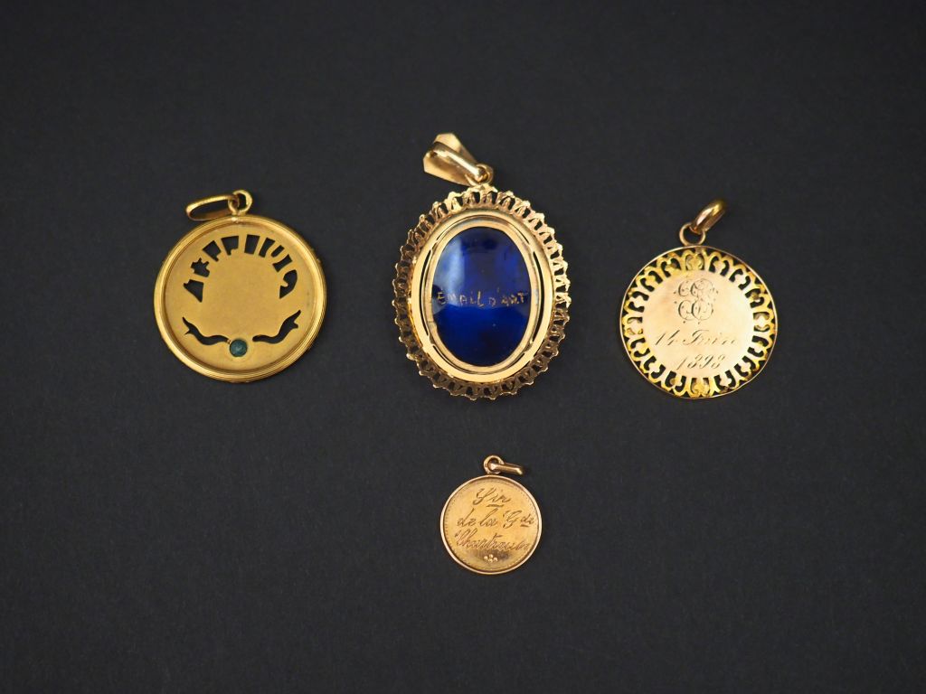 Ensemble comprenant : - une médaille religieuse ronde en or jaune, à décor de calice. Le pourtour à décor ajouré de fleurs. Diam. 2 cm - une médaille religieuse en or jaune, figurant un moine. Diam. 1,2 cm - une médaille ronde en or jaune, à décor de tiges enrubannées, de ruban serti d'une petite pierre bleu et marquée "Juillet". Diam. 2,4 cm - un pendentif en or jaune, serti en son centre d'un émail polychrome figurant une jeune femme. 2,8 x 2,3 cm Poids tel. 7,50 g