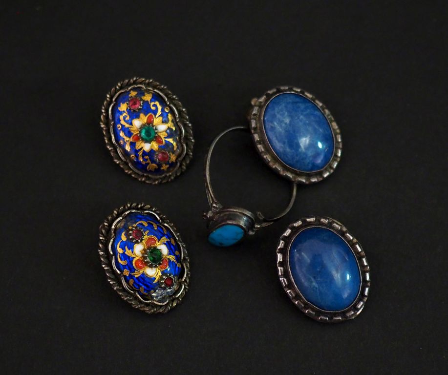 Ensemble comprenant : - une paire de clips d'oreilles ovales en argent et lapis lazuli en cabochon. 2 x 1,5 cm - une paire de clips d'oreilles de forme ovales en argent à décor émaillé polychrome de fleur et rinceaux et sertis de verroteries. 2,2 x 1,5 cm (petits sauts d'émail) - une bague de forme marquise en argent, sertie d'un turquoise. TDD. 54 Poids tel. 15,70 g